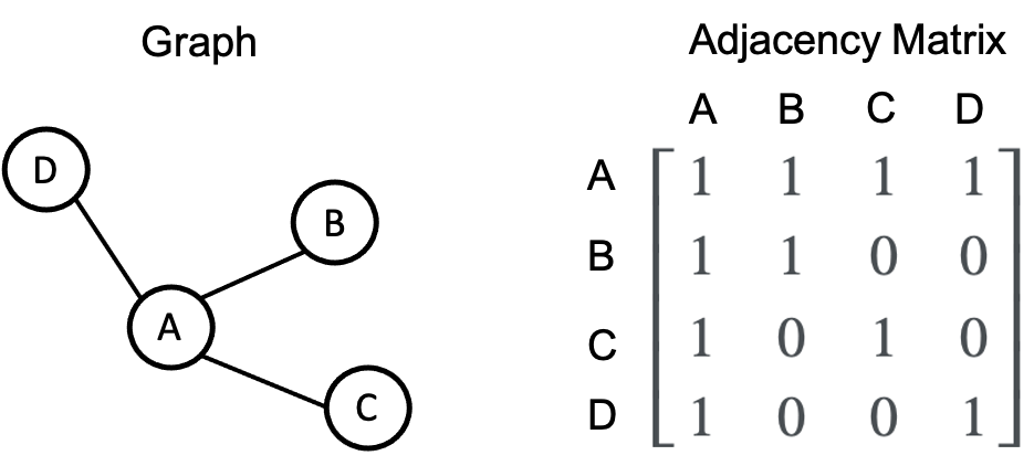 我们可以通过编码哪些节点相互连接来将图表示为一个矩阵。也就是说,如果我们有一个具有 \(n\) 个节点的图,那么我们可以定义一个矩阵 \(\boldsymbol{X} \in \{0, 1\}^{n \times n}\),使得 \(x_{i,j} = 1\) 如果节点 \(i\) 连接到节点 \(j\),否则 \(x_{i,j} = 0\)。这称为图的邻接矩阵。例如: