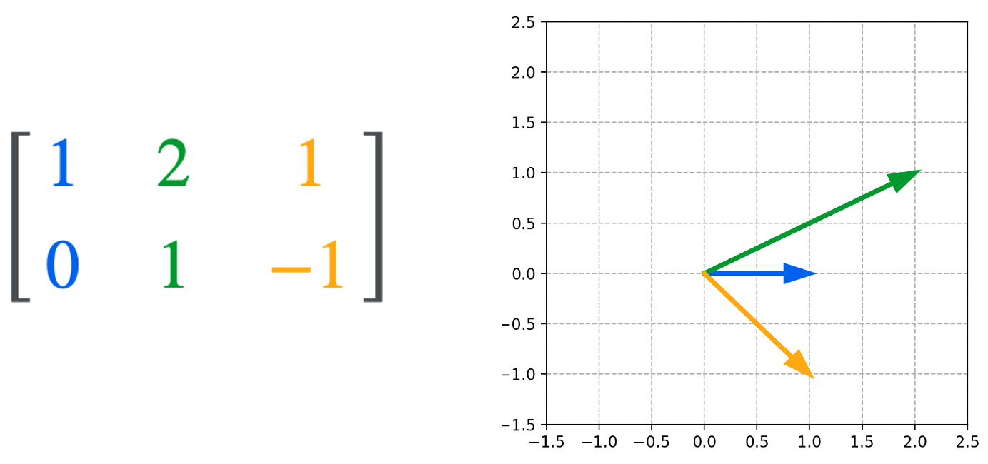 - 作为向量列表: 稍微抽象一些,矩阵也可以被视为有限维向量空间中的向量集合。