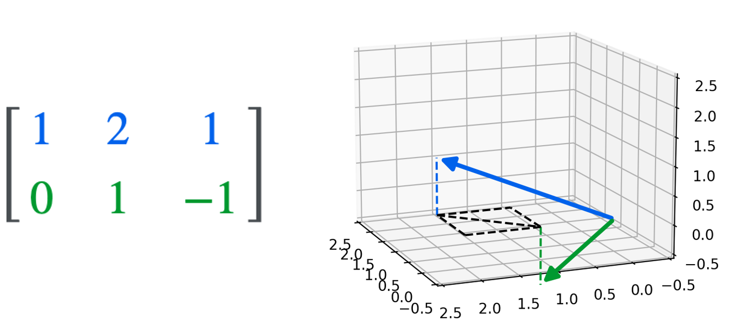 可以被视为两个三维行向量(虚线是可视化引导。彩色虚线将每个向量追溯到 \(z = 0\) 平面。黑色虚线描绘了两个向量在 \(z=0\) 平面上的差异):