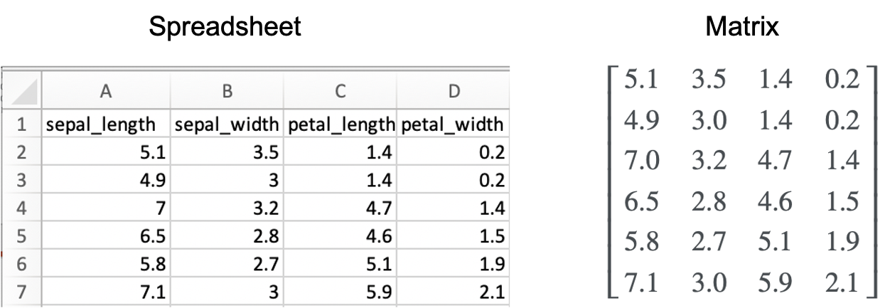 一个数值数据集,例如存储在 Excel 电子表格中的数据,可以表示为一个矩阵。也就是说,列代表不同的字段,行代表不同的条目。例如: