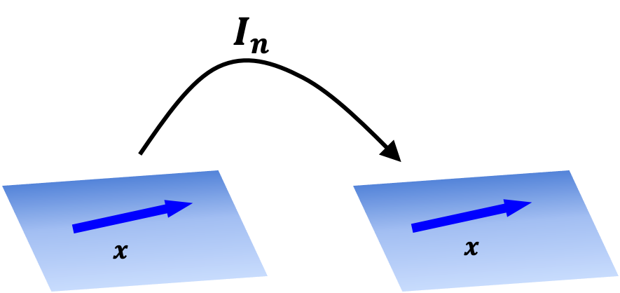 可以很容易证明,使用单位矩阵 \(\boldsymbol{I}_n\) 与任意向量 \(\boldsymbol{x} \in \mathbb{R}^n\) 进行[[矩阵-向量乘法]]将得到相同的向量 \(\boldsymbol{x}\)。因此,函数 \(T(\boldsymbol{x}) := \boldsymbol{I}\boldsymbol{x}\) 是定义域为 \(\mathbb{R}^n\) 的单位函数。下图示意性地描绘了这一点: