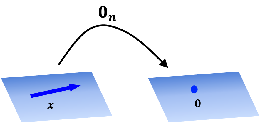 可以很容易证明,使用零矩阵 \(\boldsymbol{0}_n\) 与任意向量 \(\boldsymbol{x} \in \mathbb{R}^n\) 进行矩阵-向量乘法将得到零向量 \(\boldsymbol{0}\)。因此,函数 \(T(\boldsymbol{x}) := \boldsymbol{0}_n\boldsymbol{x}\) 是定义域为 \(\mathbb{R}^n\) 的零函数。下图示意性地描绘了这一点: